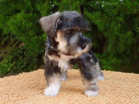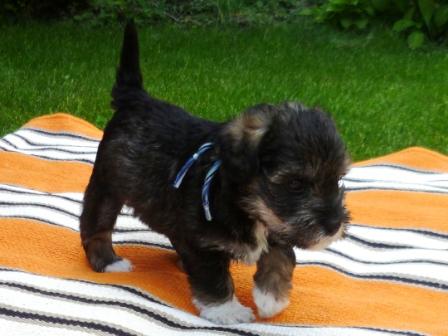 Kan kiskutya, minden lábán fehér kesztyűvel és fehér mellénnyel.